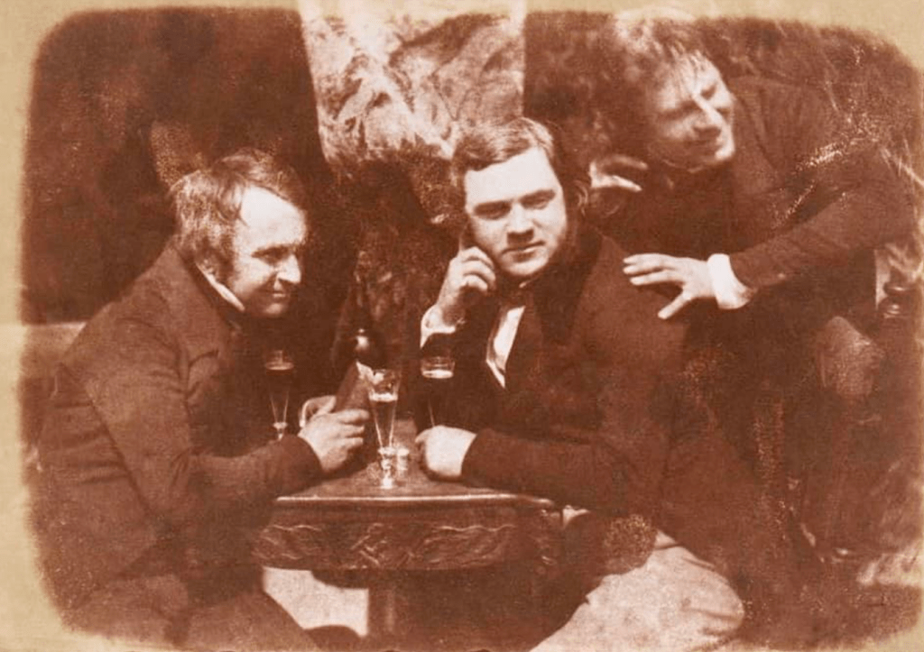 aufgenommen 1844 von david octavius hill und robert adamson, den betreibern des ersten fotostudios in edinburgh (eine kurze zusammenarbeit, da letzterer schon mit 26 an tbc starb). hill ist der grinser rechts im bild; der arzt dr. george bell in der mitte war einer der reformer der schottischen armenfürsorge; und james ballantine links war schriftsteller, glasmaler und sohn eines bierbrauers. dass die herren so kleine gläser („ale flutes“) vor sich haben, liegt daran, dass das bier viel stärker war als heute und man nicht soviel davon trinken konnte.