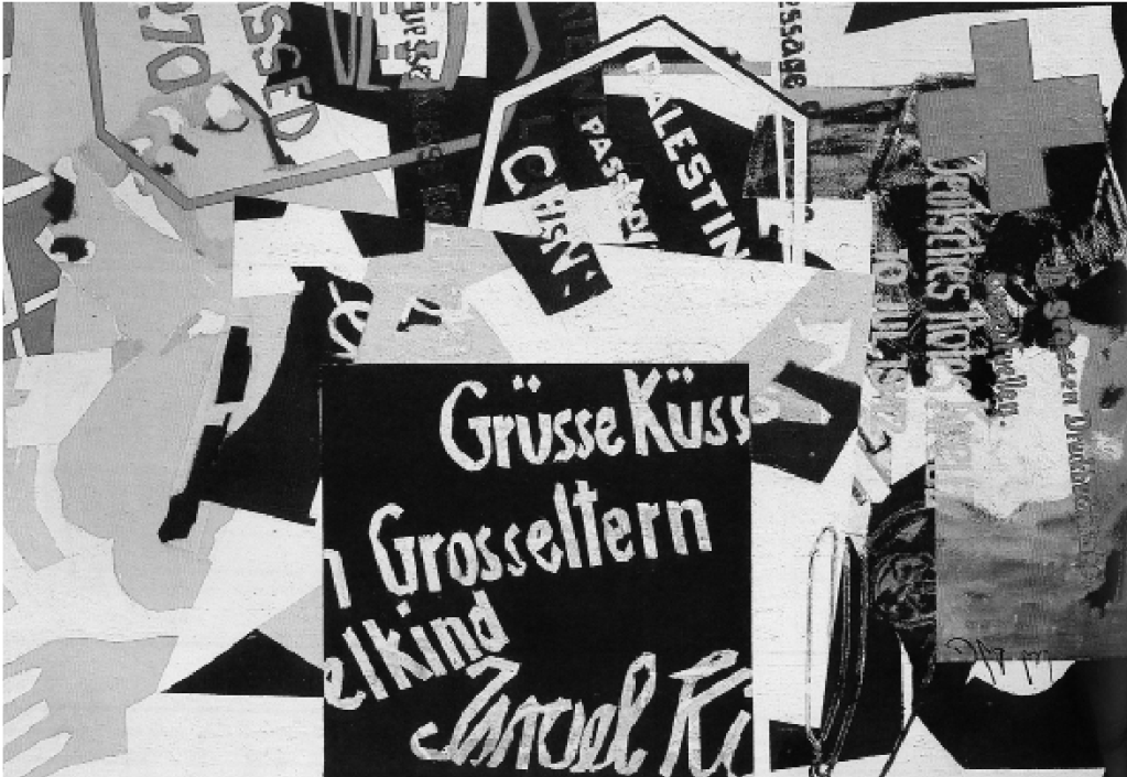 1. Abbildung: »Grüße von meinen Eltern aus dem KZ«, 1972. Die Karte, auf die sich diese Collage bezieht, hatten die Eltern Chaim Kiewes aus Anlass der Geburt ihres ersten Enkelkindes – 1942 wurde Mona Kiewe geboren – aus Theresienstadt nach Palästina geschrieben.