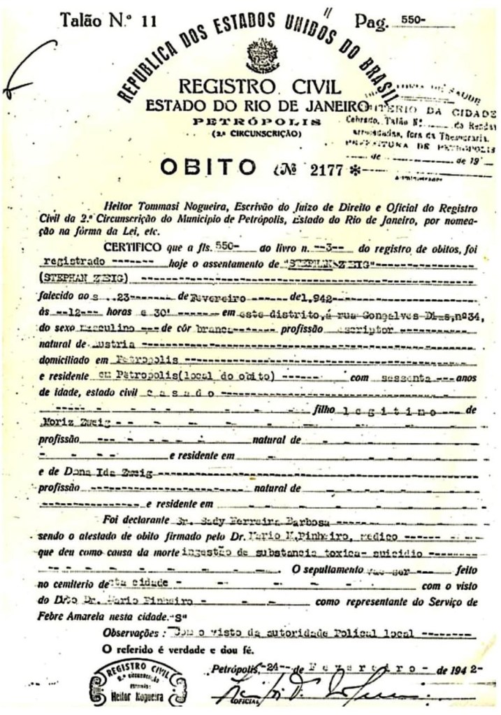 abbildungen: zweig, new york 1939 c/o eric schaal; sterbeurkunde mit eintrag des suizids am 23.2.1942