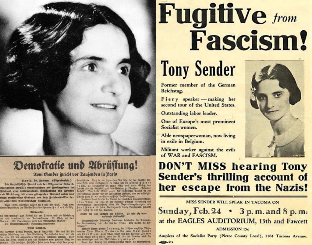 1932 war Toni Sender noch öffentlich für einen Generalstreik eingetreten, um die faschistische Machtübernahme abzuwenden. wenige Monate später musste die jüdische Sozialistin beginnen, um ihr Leben zu fürchten. Am 5. März 1933 verließ sie Deutschland. erst hielt sie sich in der Tschechoslowakei auf, bekam dann das Angebot in Antwerpen für die „Volksgazet“ zu schreiben, wurde 1934 aus Deutschland ausgebürgert und blieb nach einer dreimonatigen Vortragsreise 1935 in den USA. Sie schrieb ihre Memoiren, die zu Recht den Titel „The Autobiography of a German Rebel“ tragen, wurde 1943 amerikanische Staatsbürgerin und Wirtschaftsspezialistin bei der United Nations Relief and Rehabilitation Administration. Sie engagierte sich bei den Vereinten Nationen u. a. in der Menschenrechtskommission, der Kommission zur Rechtsstellung der Frau und als Vertreterin des Internationalen Bundes Freier Gewerkschaften.