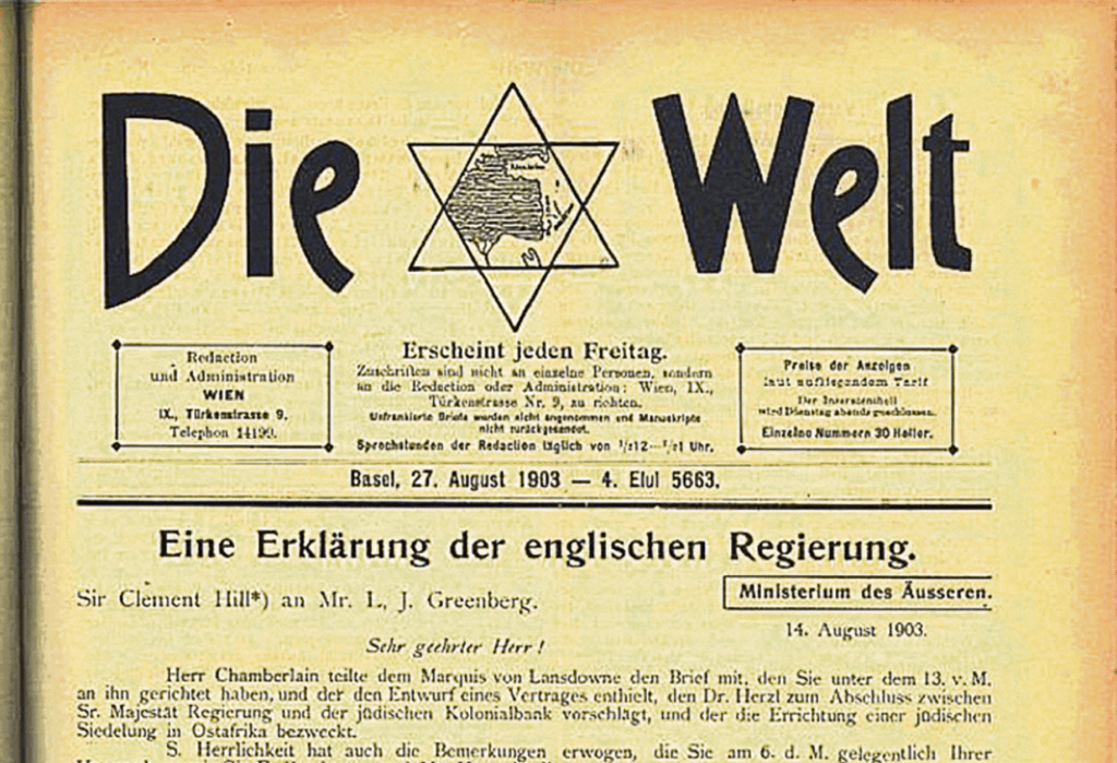 Max Nordau (geboren als Simcha Maximilian Sudfeld), von dem auch der Topos des „Muskeljuden“ als Gegenstück zu den „unbeholfenen und ausgemergelten, hustenden Jammerzwergen des östlichen Ghettos“ stammt, unterstützt, wenn auch widerwillig, den Uganda-Plan, das Angebot der Briten zur Ansiedlung verfolgter Juden am afrikanischen Mau-Plateau (heute Kenia), den man im August auf dem 6. Zionistischen Kongress diskutiert hatte (und auf dem 7. verwarf).