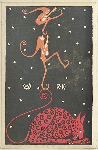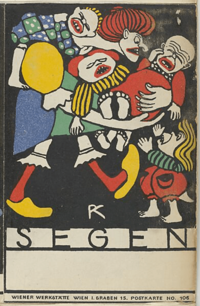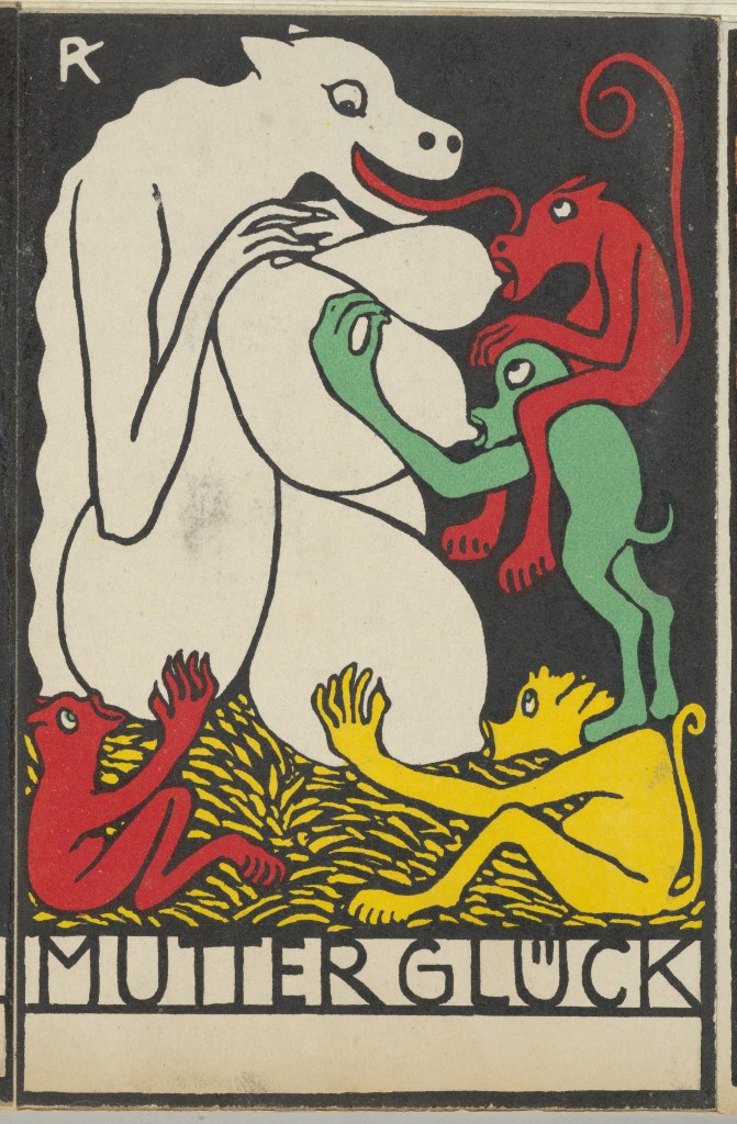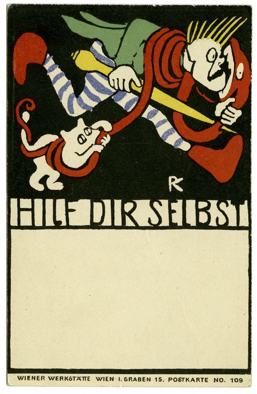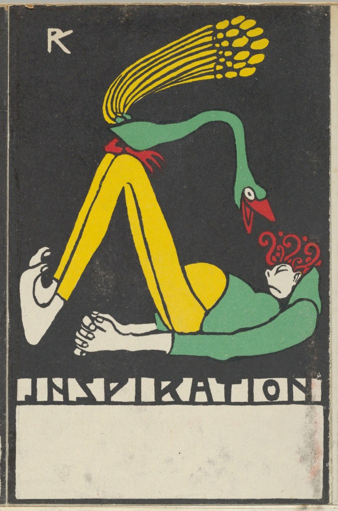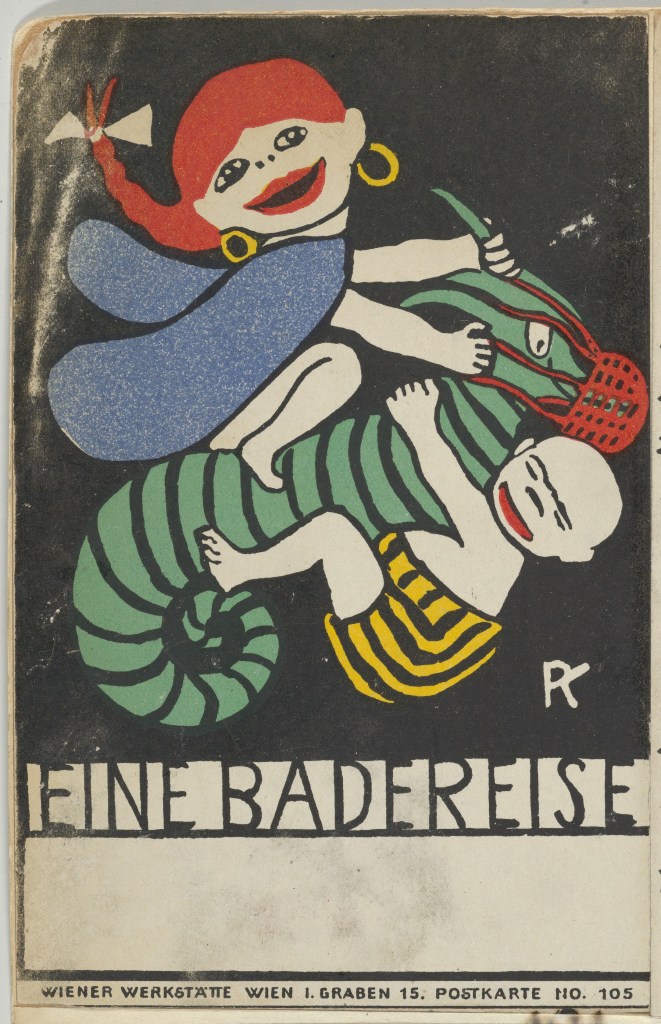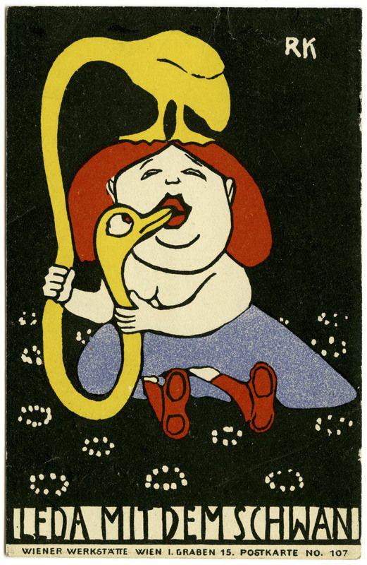 Der begabte Student entwickelt schnell einen eigenen, markanten Stil und wurde spätestens 1906 über Wien hinaus bekannt, als ihn die von Koloman Moser und Josef Hoffmann gegründete Wiener Werkstätte engagierte, die der „seelenlosen“ Massenproduktion der Fabriken qualitativ hochwertiges Kunsthandwerk entgegen setzen wollte. Rudolf Kalvach war einer der ersten und jüngsten Nachwuchskünstler der Werkstätte, für die er in den folgenden Jahren Postkarten und Bilderbögen entwarf, die sich mit ihrem meist schwarzen Hintergrund und kräftigen Figurenfarben deutlich von den Arbeiten anderer Kollegen abhoben – aus den anfänglichen gängigen Motiven für Glückwunschkarten wurden bald satirische, surreale, groteske oder mythologische Fabelwesen und Szenen, wie die pummlige Leda mit dem Zeus-Schwan auf dem Kopf von 1908.