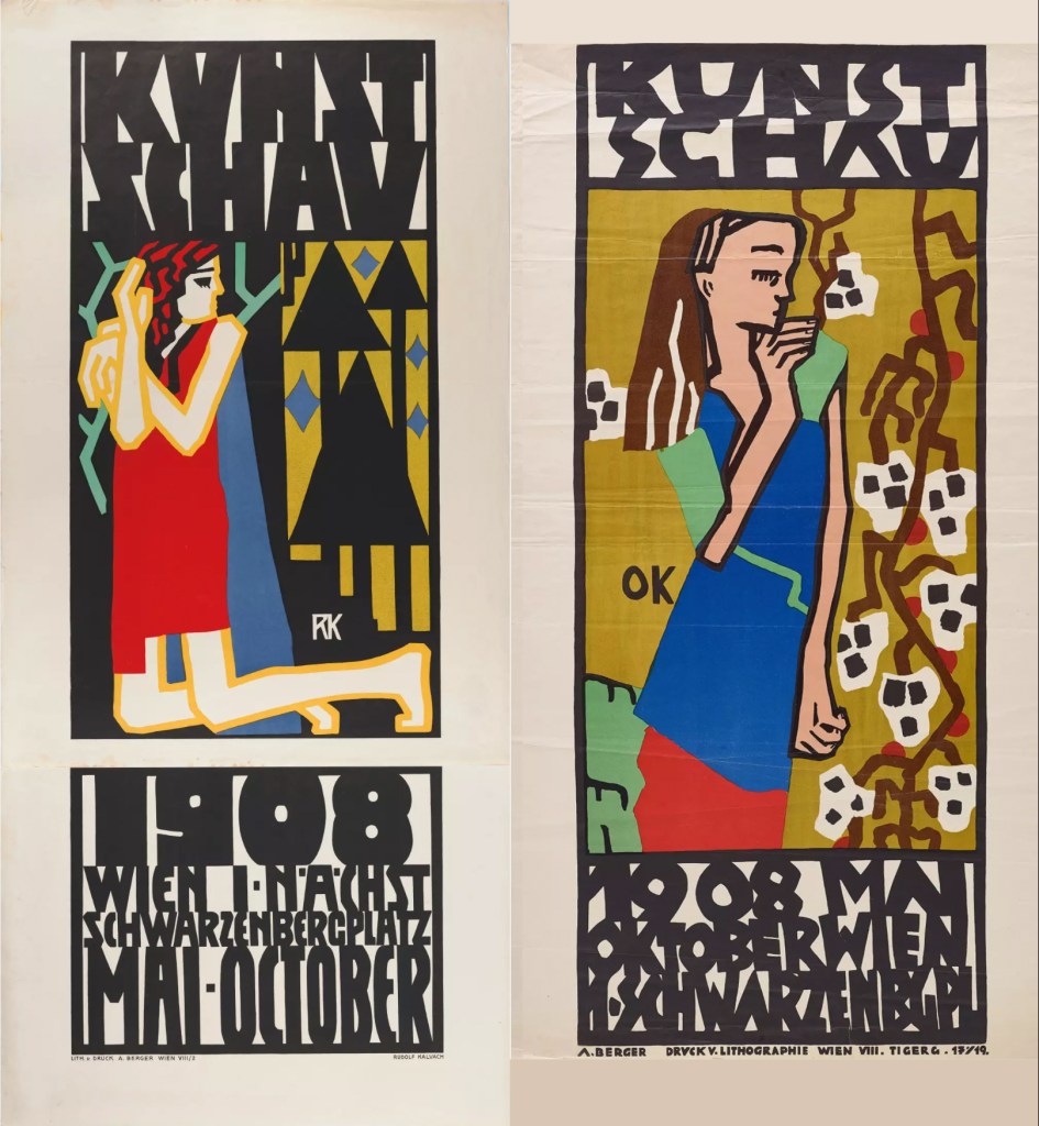 Ganz anderer Art war Kalvachs Werbeplakat für die Wiener „Kunstschau 1908“, das zur einer Ikone der Wiener Moderne wurde. Diese Bild gewordene Absage an den Jugendstil seiner Lehrer ähnelte stark dem zum selben Anlass entworfenen Druck seines Studienkollegen Oskar Kokoschka, und die Kunsthistoriker streiten sich bis heute darüber, wer beim wem abgekupfert hat (links Kalvach, rechts Kokoschka) oder ob die Beiden ihre Arbeiten bewußt ähnlich angelegt hatten. Seit der ersten großen Kalvach-Retrospektive in Wien 2012 sind sich aber immer mehr Leute einig, dass hier Kalvach den drei Jahre jüngeren Kokoschka beeinflusst hatte.