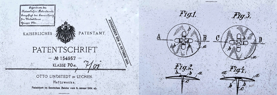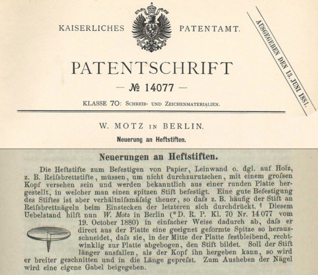 Bei „W. Motz“ handelt es sich um den Mechaniker und Schraubenfabrikanten Wilhelm Motz. Der hat, nachdem er sich 1880 die einteilige Reißzwecke hatte schützen lassen, in Schöneberg mit der Firma C.W. Motz & Co. (die übrigens später Koppelschlösser und Uniformknöpfe für die Wehrmacht produziert hat) eine Fabrik für Silberstahl-Reissbrettstifte, Teppichnägel etc. eröffnet (u.a. annonciert im Katalog der „Deutschen Allgemeinen Ausstellung für Unfallverhütung“ 1889) und jährlich um die 30 Millionen Reissbrettstifte hergestellt – vernickelte, verzinkte und auch mit „farbigen Dessins“ versehene… Die 1904 patentierte Innovation der Lychener Johann Kirsten bzw. Otto Lindstedt scheint hingegen so geringfügig gewesen zu sein, dass sie nicht mal mehr im „Polytechnischen Journal“ erwähnt ist. Genau wie bei den (etlichen) anderen Patenten, die sich in dieser Zeit um Heftzwecken drehen, dürfte es auch bei ihr „nur“ noch um Details gegangen sein, mit denen man die längst erfundenen Helferlein einfacher und billiger in Serie herstellen konnte.