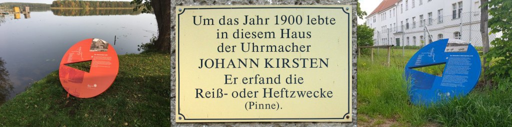 August Kirsten soll sich hier in den 1870er-Jahren die Urform der Heftzwecke oder „Pinne“ ausgedacht haben, um Rechnungen oder Zettel an der Wand zu befestigen, was ihm und seinem Kompagnon Christian Eichmann 1879 in einem Patent bestätigt worden sei. Als eigentlicher Erfinder der Reißzwecke wird in Lychen aber sein Sohn Johann Kirsten gefeiert. Er, über den man nicht viel weiß – weder, wann er geboren wurde, noch, wann er gestorben ist, weder, wie er aussah, noch, wo sich sein Grab befindet, hatte eine kleine Uhrmacherwerkstatt und habe Vaters Pinne verbessert. Das Patent Nr. 154957 Klasse 70E auf die „Heftzwecke“ bekam dann aber einer anderer. Denn Johann Kirsten hat sein ganzes Geld versoffen und auf einer seiner Durststrecken die Erfindung 1903 für kleines Geld an den Kaufmann Arthur Lindstedt weiterverkauft. Dessen Sohn Otto hat sie wiederum beim Kaiserlichen Patentamt eingereicht und am 8. Januar 1904 dafür ein Patent erteilt bekommen.