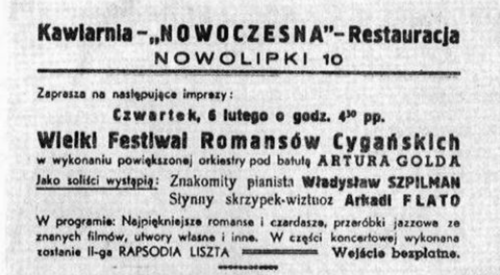 Während Henryk Gold und Jerzy Peterburski bei Kriegsbeginn mit einem Orchester in der Sowjetunion waren und sich später der polnischen Armee unter Władysław Anders anschlossen (Henry komponierte später in Palästina unter dem Namen Zvi Zahawi noch etliche bekannte Lieder), saß Artur Gold in Warschau fest und musste nach der deutschen und sowjetischen Invasion von der Chmielna Straße im nun „arischen“ Teil der Stadt in das neu geschaffene Juden-Ghetto umziehen. Er spielte auch im Ghetto weiter und trat mit seinem Orchester unter anderem im Café „Nowoczesna“ in der Nowolipki-Straße auf (beim „Großen Festival der Zigeuner-Romanzen“ auf dem Plakat unten beispielsweise zusammen mit Wladislaw Szpilman, der außerhalb Polens spätestens seit Polanskis Film „Der Pianist“ bekannt sein dürfte). Doch Ende 1942, sein Bruder Adam war im Ghetto gestorben, wurde Artur wie die meisten Ghetto-Insassen in das Arbeits- und Vernichtungslager Treblinka deportiert.