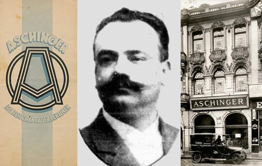 august aschinger, am 8. april 1862 in oberderdingen in württemberg geboren, gründete 1892 in berlin den bald größten gastronomiebetrieb europas, mit stehbierhallen („bierquellen“), konditoreien und restaurants. die ungeheure popularität der aschingerhäuser, vor allem bei den weniger betuchten, rührte daher, dass man hier bei einer auf fein gemachten ausstattung (kronleuchter usw.) sehr preiswert essen und trinken konnte – bier zum einheitspreis von 10 pfennigen, bockwurst, erbsensuppe… und schrippen dazu, soviel in den magen passte. die enge zusammenarbeit der aschinger ag mit den nazis erlebte august nicht mehr. er starb schon 1911 und wurde auf dem luisenfriedhof in berlin beerdigt.