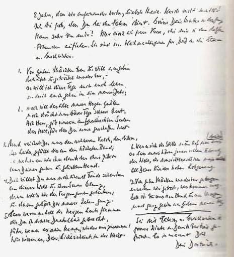 Es sind nun fast 2 Jahre, daß wir aufeinander warten, liebste Maria. Werde nicht mutlos! Ich bin froh, daß Du bei den Eltern bist. Grüße Deine Mutter und das ganze Haus sehr von mir. Hier noch ein paar Verse, die mir in den letzten Abenden einfielen. Sie sind der Weihnachtsgruß für Dich und die Eltern und Geschwister: