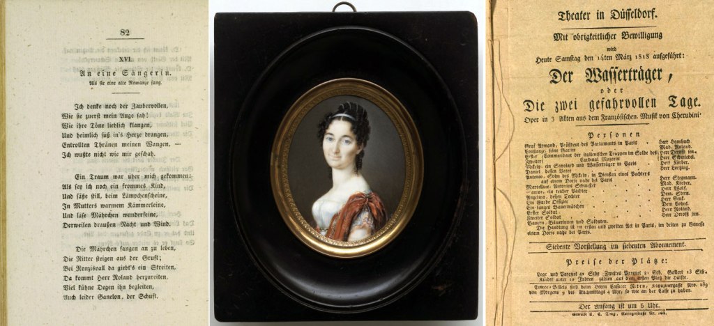 Nach dem Concert war sie zum Souper in unserm Haus, an dem Heinrich und wir übrigen Geschwister Theil nahmen. (…) Heine hatte den ganzen Abend über nur Blicke für die reizende Sängerin. Wer konnte ahnen an jenem Abend, was in der Brust des jungen Dichters vorging, von dem damals Niemand wußte, daß die Poesie schon sein ganzes Ich erfaßt hatte. Wie unendlich groß war die Überraschung der Mutter am andern Morgen, als ihr der geliebte Sohn, dessen sinnenden Block bisher Niemand zu deuten verstand, das erwähnte Gedicht, kalligraphisch schön auf Velinpapier geschrieben und mit Arabesken verziert, ängstlich übergab. Der Schluß lautetet: Das war ein laut verworr’nes Schallen, / Das mich aus meinem Träumen rief. / Verklungen war jetzt die Legende, / Die Leute schlugen in die Hände, / Und riefen „Bravo“ ohne Ende; /Die Sängerin verneigt sich tief.