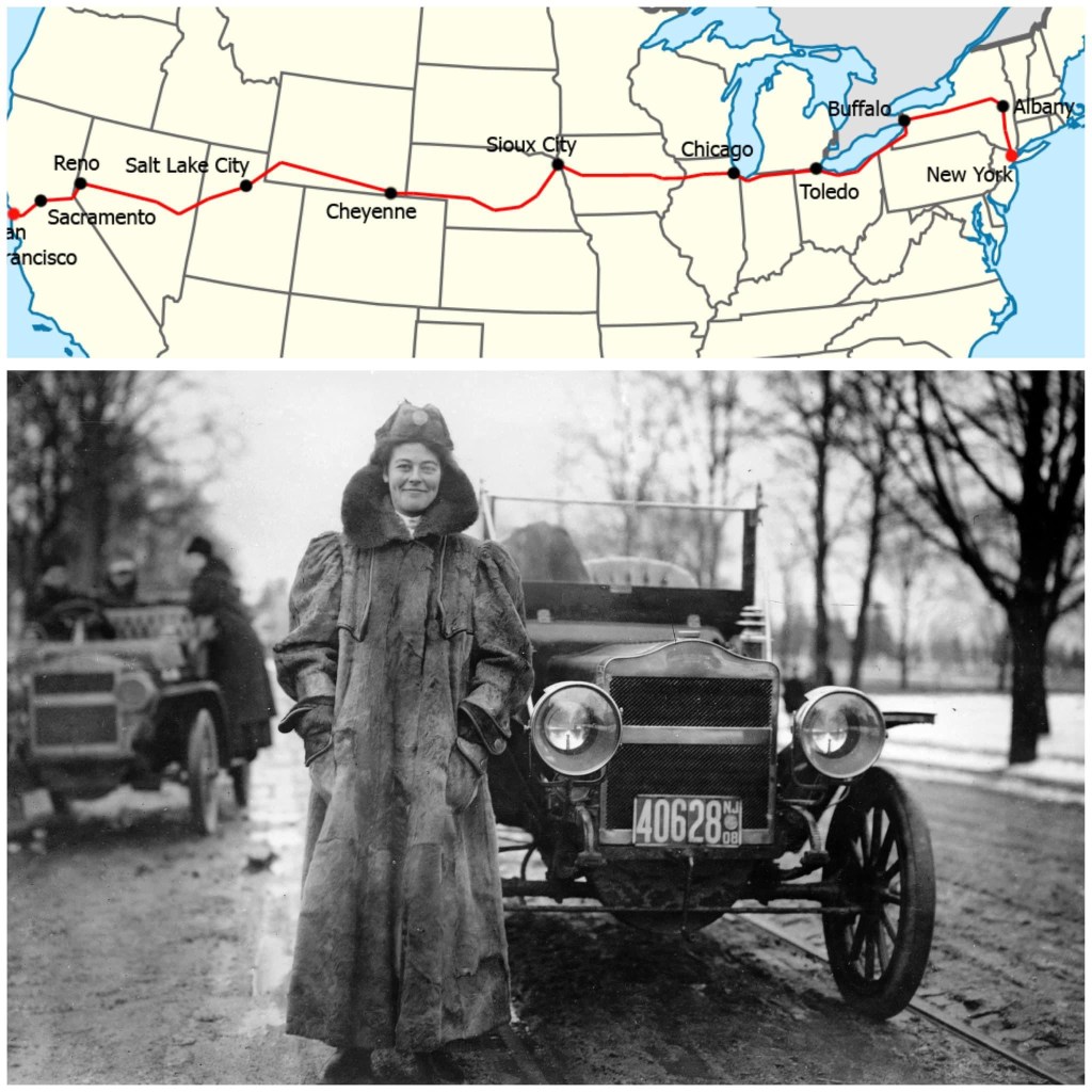 Allerdings bestand ihr Mann darauf, dass sie die geplante Route von New York nach San Francisco, die bis dahin nur ein Dutzend Männer bewältigt hatte, nicht allein fuhr. Also ließ sie sich von drei Frauen begleiten, die aber allesamt nicht Autofahren konnten und an besonders unwirtlichen Abschnitte der Strecke dann doch lieber auf die Eisenbahn umstiegen.