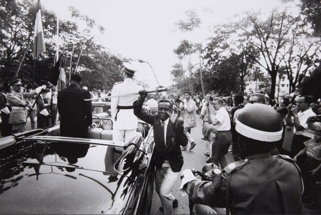 1960 war das jahr, in dem die europäischen mächte ihre letzten kolonien in die unabhängigkeit entließen. lebeck war als fotograf für das hamburger magazin „kristall« in afrika unterwegs. den eigentlichen fototermin, die begrüßung des belgischen königs durch den kongolesischen staatspräsidenten joseph kasavubu am flughafen in léopoldville hatte der deutsche verpasst, weil er sich noch ein dessert in einem belgischen restaurant gegönnt hatte; und auch hier nun hastete er dem konvoi hinterher, statt wie alle anderen fotografen davor her zu laufen. zu seinem glück. der elegant gekleidete junge mann, der sich baudouins ehrendegen vom rücksitz des offenen wagens geschnappt hatte, lief genau auf ihn und seine kamera zu. klick!