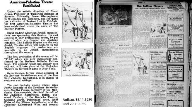 Über eine weitere Aufführung 1940 in Buenos Aires in der Regie von Jakob Buzgan sind nicht mehr als die nackten Daten zu finden, dafür gibt es aber Details über die Inszenierung, die im November 1939 in New York zu sehen war. Hier gehörte das Stück als Gegenwartsbeitrag zum kulturellen Rahmenprogramm des „Jewish Palestine Pavilion“ bei der Weltausstellung und war unter dem Titel „The Trial“ die erste Produktion eines gerade gegründeten „American-Palestine Theatre“ namens „The Balfour Players“, des einzigen jüdischen Theaters in den USA, das auf Englisch spielte, obwohl die Truppe fast vollständig aus emigrierten deutschsprachigen Bühnenkünstlern bestand. Im Fall von Bat Doris Stück übernahm Benno Frank (vorher Wiesbaden, Hamburg, Tel-Aviv) die Regie, Heinz Condell (ehemals Berliner Staatstheater, der schon an der Berliner Kulturbund-Aufführung beteiligt war) die Kostüm- und Bühnenbildgestaltung und auf der Bühne standen u.a. Olga Fuchs (Dresdner Staatstheater), Martha Ferber (Münchener Kammerspiele), Sigmund Nunberg (Deutsches Theater), Rudi Weiss (Wiener Volkstheater) und Berthold Berndt (Jüdischer Kulturbund Berlin).