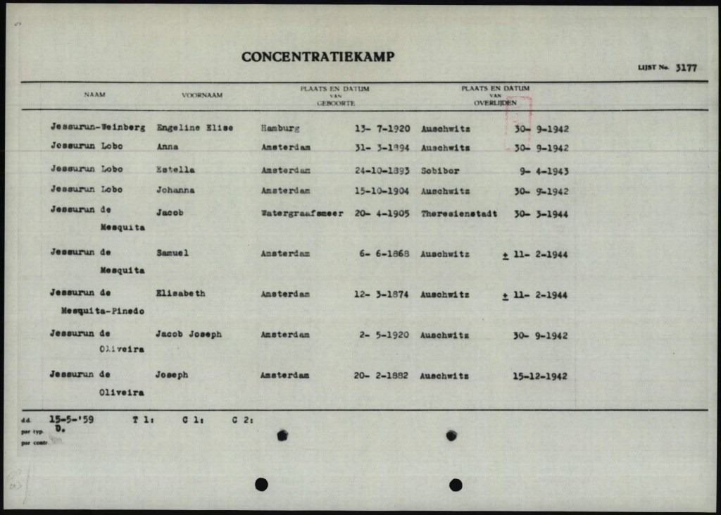 Doch auch ihre quasi »adlige« Abstammung aus dem sephardischen Zweig des Judentums konnte die Familie am Ende nicht vor dem deutschen Rassenwahn und der Deportation bewahren. In der Nacht vom 31. Januar zum 1. Februar 1944 wurde sie verhaftet und nach Westerbork geschafft. Samuel und Betsie wurden weiter nach Auschwitz verschleppt, wo sie vermutlich am 11. Februar 1944 starben. Jaap, der Kunstgeschichte studiert, das Studium jedoch nie abgeschlossen und bis zum Schluss bei seinen Eltern gewohnt hatte, starb am 30. März 1944 im Lager Theresienstadt.