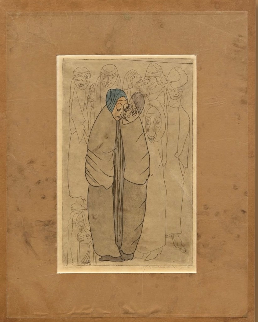 Die Radierung mit den zwei tuschelenden Frauen und dem deutschen Stiefelabdruck, die er vom Boden der verwüsteten Wohnung seines Lehrers aufgelesen hatte, hing für den Rest seines Leben in seinem Atelier.