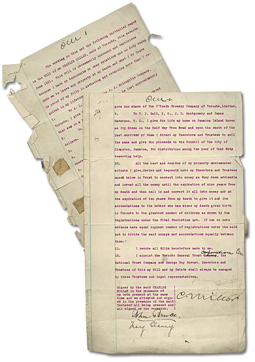 Elf Jahre zuvor, am 31. Oktober 1926, war der angesehene Rechtsanwalt Charles Vance Millar in seinem Büro in Toronto mit 73 Jahren nach einem Herzinfarkt tot zusammengebrochen. Millar hatte, wie man bald erfahren sollte, einen leicht schrägen Humor, der jahrelang für Schlagzeilen sorgen sollte. Denn sein „letzter Wille“ hatte es in sich: