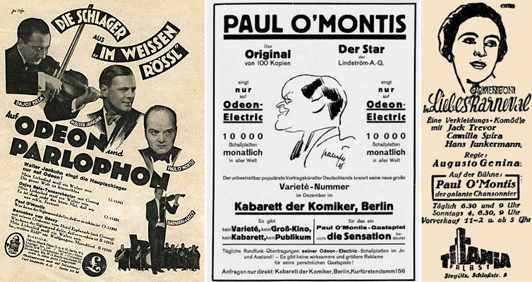Bald tourt Paul O’Montis als Unterhaltungskünstler auch durch die Lande, nach Hannover oder Hamburg und ins Ausland, nach Riga oder Königsberg. Er hat Witz und Selbstironie, seine Chansons strotzen von sexuellen Anspielungen, auch wenn er sich nicht öffentlich zu seiner Homosexualität bekennt. Doch zu dieser (Weimarer) Zeit scheint alles möglich. Das Androgyne feiert Triumphe; nicht nur die „neue Frau“, auch der „neue Mann“ bricht zu neuen Ufern auf und O’Montis kann problemlos einen frechen Schlager wie „Was hast du für Gefühle, Moritz?“ aufnehmen, ein frühes Beispiel für einen „LGBT-Song“, getextet von Altmeister Fritz Löhner-Beda, der später in Auschwitz ermordet wird, und wie auf Paul O’Montis selbst zugeschnitten: