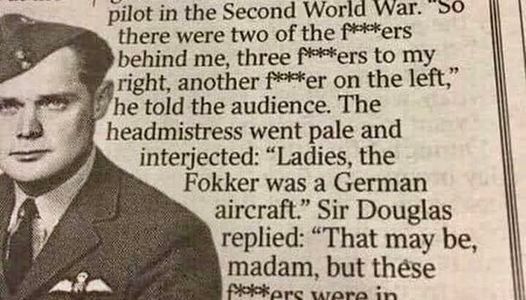 war of words:)„so there were two of the f***ers behind me, three f**ers to my right, another f**er on the left“, he told the audience. the headmistress went pale and interjected: „ladies, the fokker was a german aircraft." sir douglas replied: „that may be madam, but these f**ers were in messerschmitts.«[douglas bader, 1910-1982, britischer jagdflieger, … Elegante Wortwahl weiterlesen
